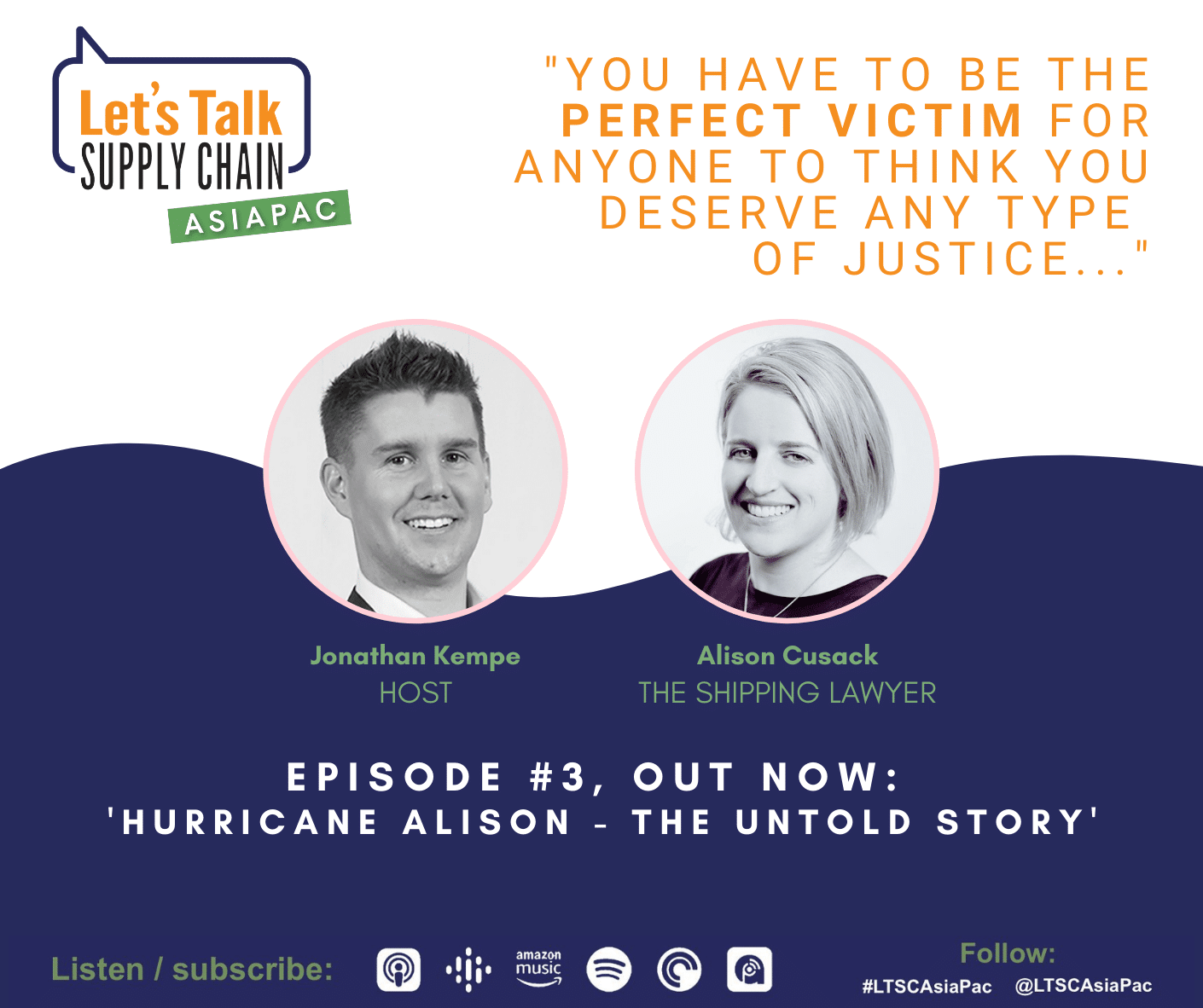 Join host Jonathan Kempe, and special guest Alison Cusack “The Shipping Lawyer” aka Hurricane Alison on Let’s Talk Supply Chain Asia Pacific’s’ third episode. Jonathan and Alison cover several highly relevant and powerful topics, in a raw and unedited episode:
